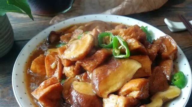 下入炸好的豆腐块,淋入半碗水,再加入生抽,烧开,小火烧制入味,待烧制剩少许汤汁时,下入尖椒圈翻炒均匀