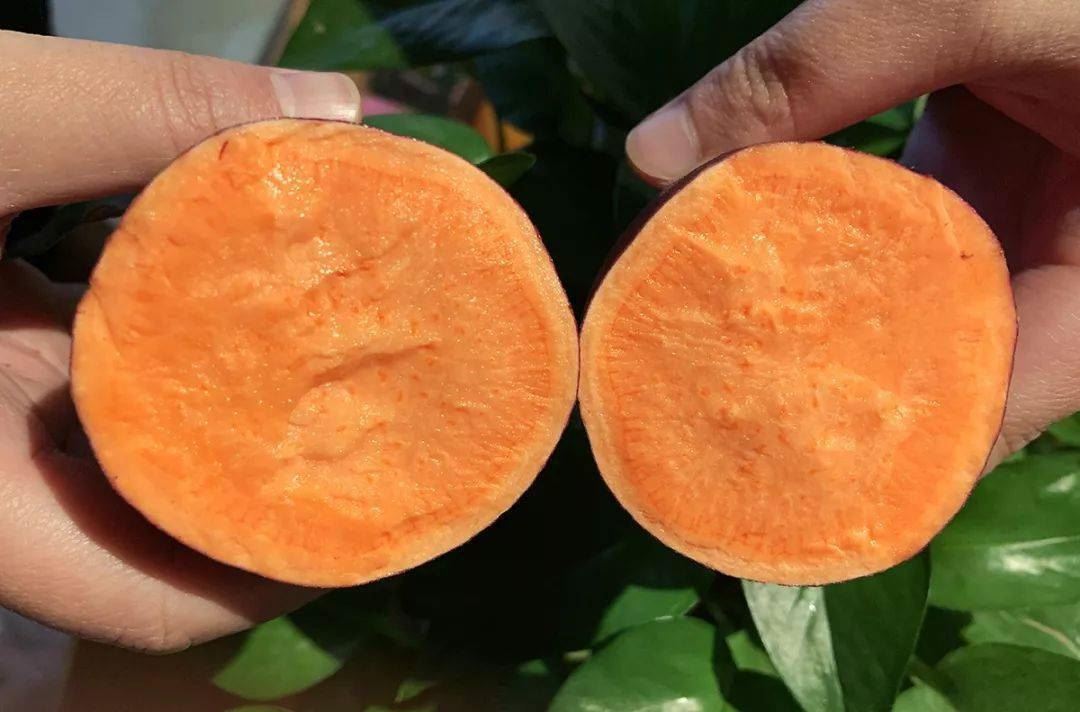 生的红蜜薯用手掰开,可以看到切面为橙黄色,水分饱满,透着满满的甜蜜。