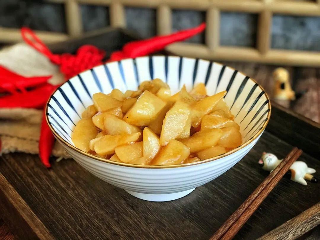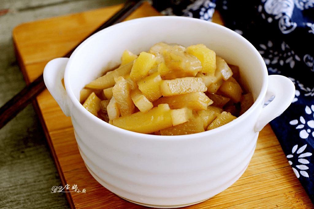 2.白萝卜切比土豆细点的条,这样才能熟到一起去;