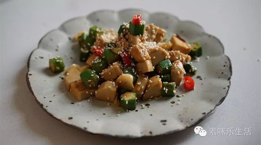 材料:辣椒、秋葵、素鸡、一些白芝麻
