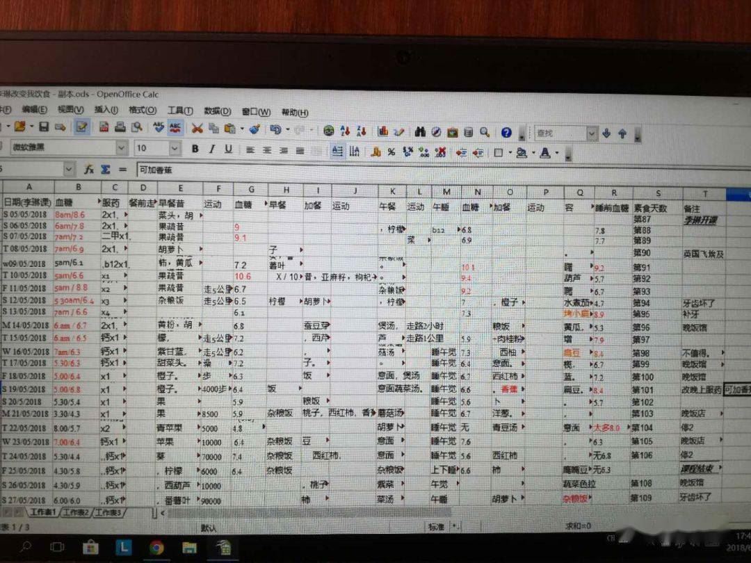 我还把自己这次21天逆转营的生活状况,除了交作业外,还自己记录在EXCEL表上,方便分析查找原因。