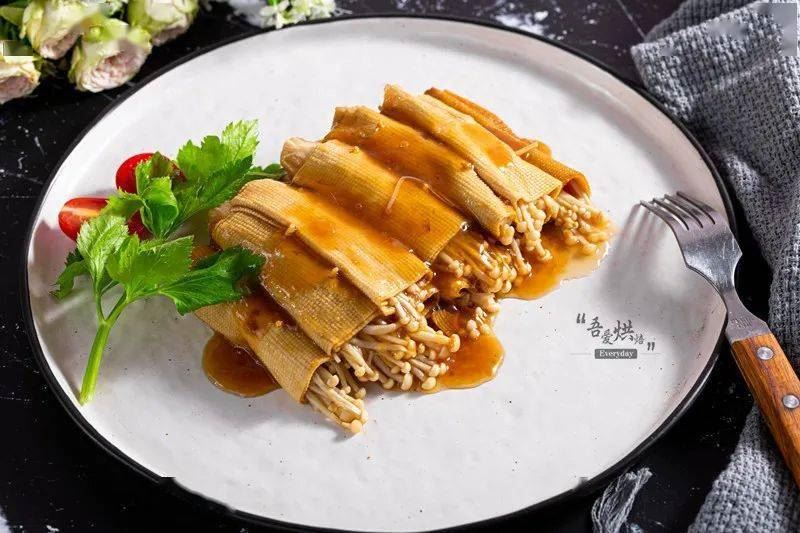 6. 热油起锅,把豆皮金针菇卷放入到锅中,倒入酱汁,中小火熬煮5分钟即可出锅。
