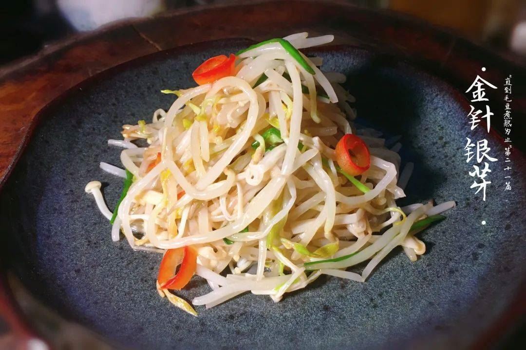 2. 热锅热油,下金针菇翻炒,稍软后下绿豆芽;