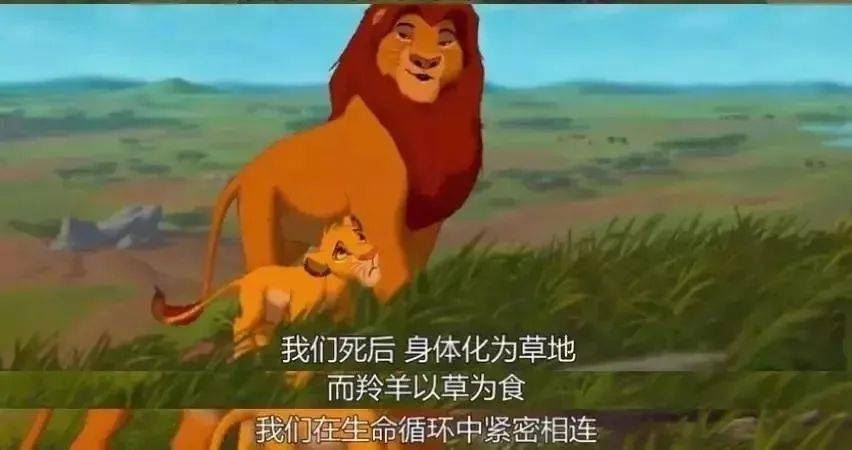 木法沙回答说:“我们死后,一定会成为草,而羚羊是吃草的。所以,在这个生命圈里面,都是互相有关联的。”