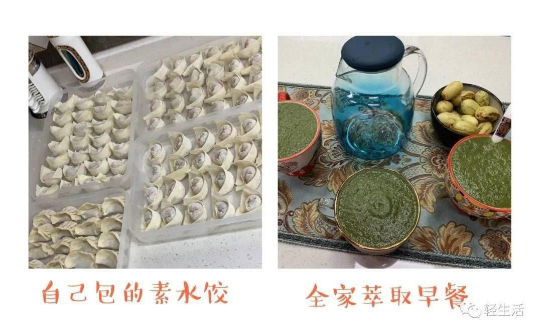 我自己进厨房,不光做蔬果早餐,还做中餐、晚餐,老公、儿子都开始回家来吃饭了,有时甚至中午都赶回来吃午饭。我会给他们做各种好吃的饺子,馅料是各种各样的蔬菜,各种绿叶菜、胡萝卜、白菜、香菇。