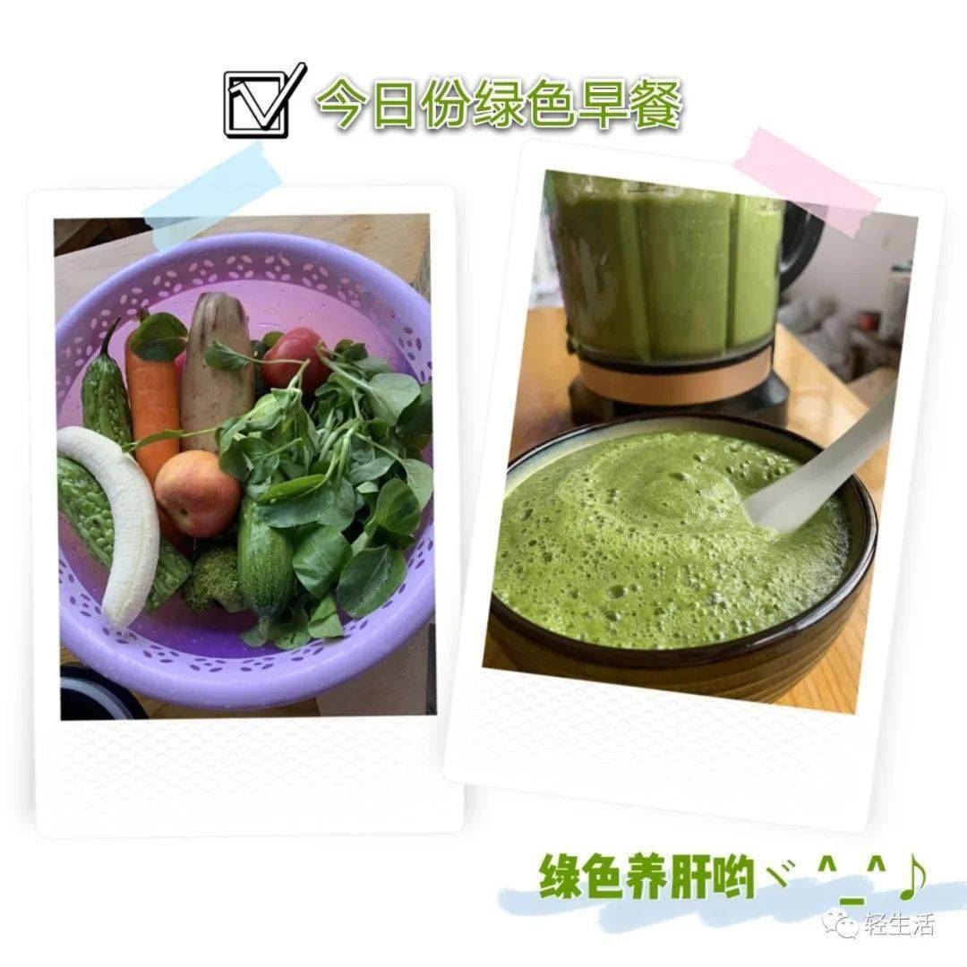 我最大的改变就是早餐,会有很多绿叶菜,地瓜叶、南瓜叶差不多会有两斤,都是我爸妈种的,水果相对比较少,会有苹果、梨、柠檬、香蕉、猕猴桃等,这样的蔬果萃取我一个人一天大约要喝两千毫升。