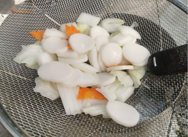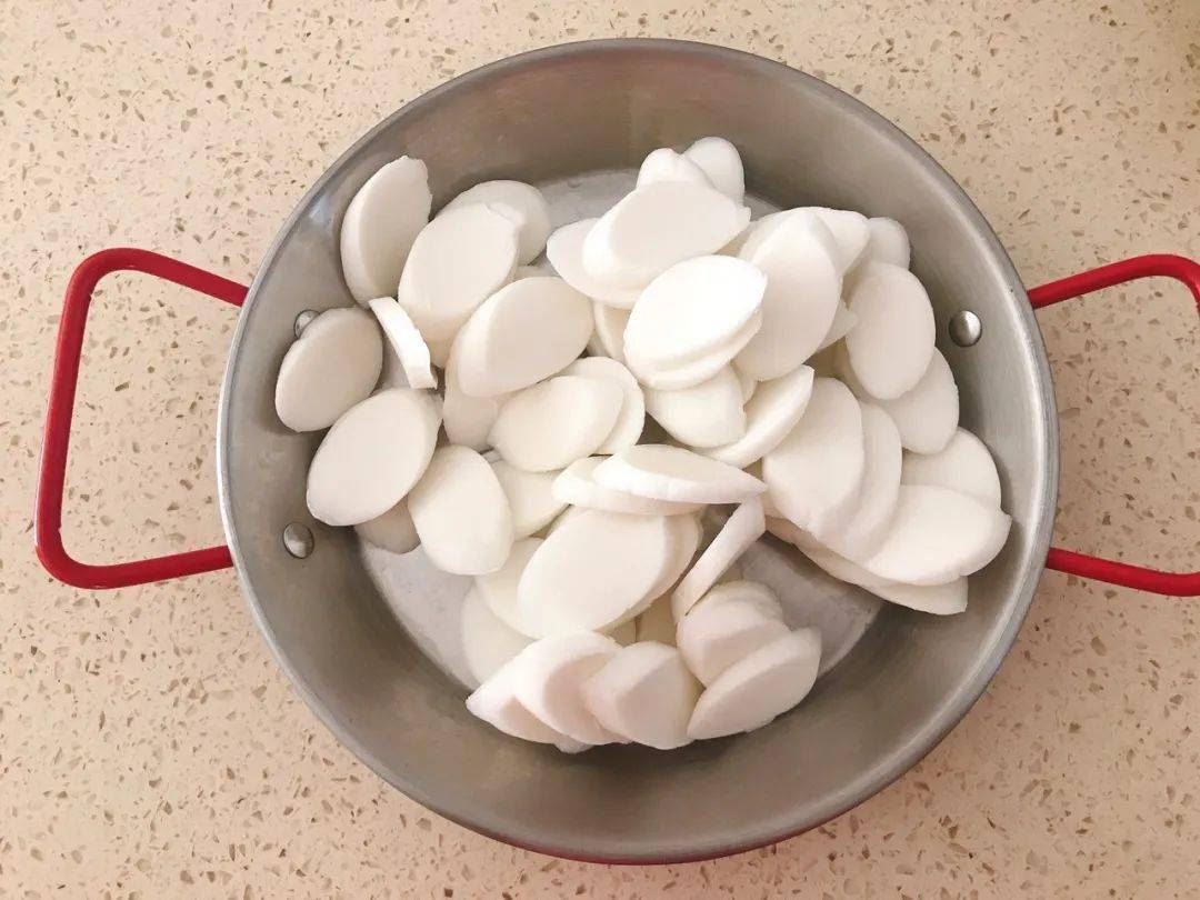 3. 年糕片水煮后,沥干水捞出备用。