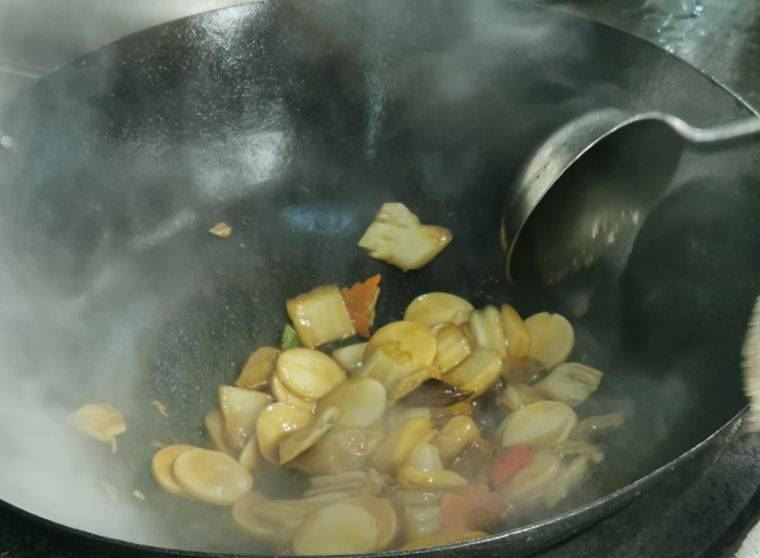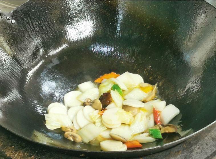 4. 锅内热油,将准备好的食材下锅煸炒。