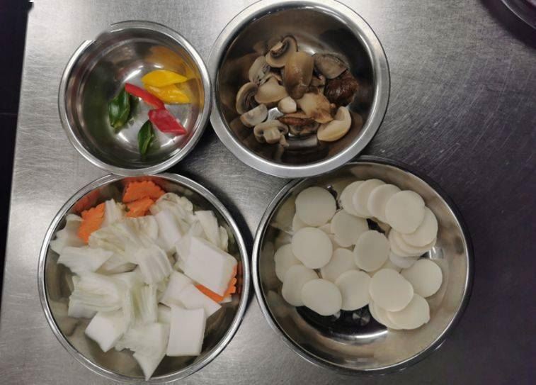 1. 菌菇、白菜、萝卜改刀切片。
