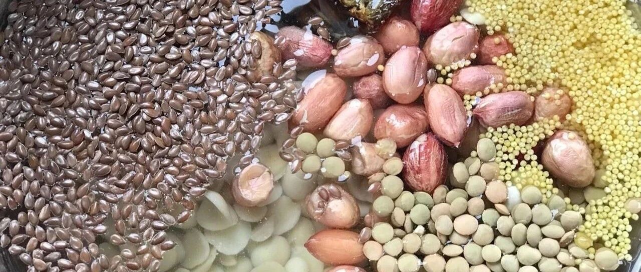 脱皮北杏仁、小扁豆、花生、亚麻籽、小米、百合。放入豆浆机选择五谷模式即可。