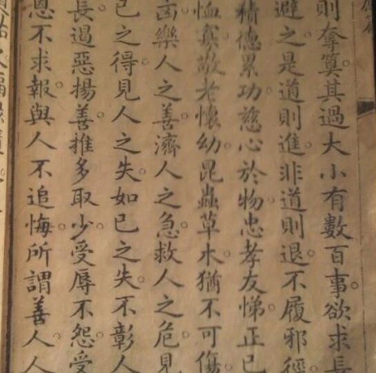 昆虫草木,尚且不能伤害。别人有不吉利事,应怜悯他,高兴别人做好事。别人有急需时,慨然济助。别人有危险时,立刻救他。人我一体,他人的得失,等于自己的得失。不宣扬他人的缺点,不夸耀自己的优点。阻止恶事,表扬善事,把多的让给人,自己取少的。受人欺侮,不怨恨,受到宠爱,要看成像天上掉下来一般惊畏,并加紧积功德。给人恩惠,不求报答。施舍给人,没有后悔。