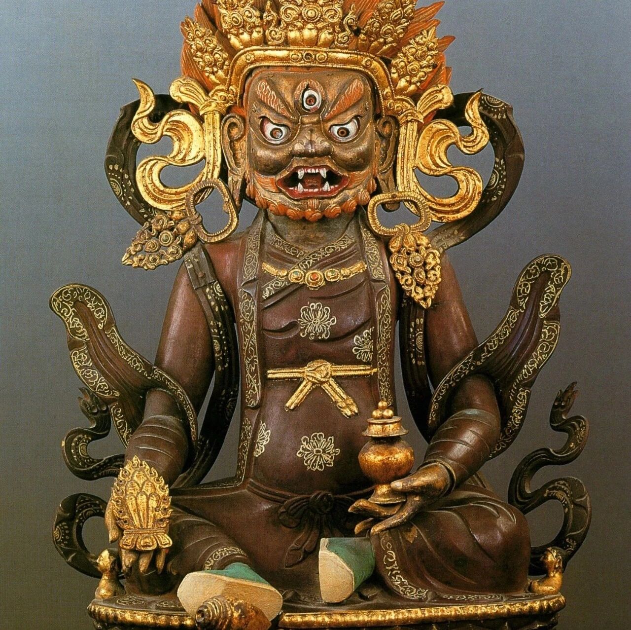 尚龙护法像(北京雍和宫):药师佛之护法,为药师佛殿主供护法之一。深为学习藏医之僧人供养。法相为身蓝色,穿绿袍,三目圆睁,血口獠牙,金发怒张。头上有一绿蛇为饰,一手托宝瓶,一手托摩尼宝,以威武之姿半跏趺坐于莲花上,脚下踩伏仰二人。