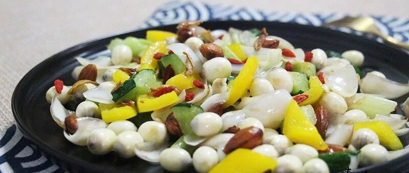 莲蓬去壳剥皮,西芹、青瓜和黄甜椒切小菱形块,大杏仁用饮用水预先浸泡半小时洗净,百合切去两头分成一片片