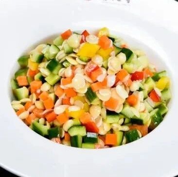 原料:杏仁、青瓜、胡萝卜、彩椒