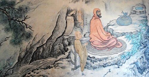 达摩祖师于中国南朝梁武帝时期航海到广州。梁武帝信佛,达摩至南朝都城建业会梁武帝,面谈不契,遂一苇渡江,北上北魏都城洛阳,后驻锡嵩山少林寺,面壁九年,传衣钵于二祖慧可大师。后出禹门游化终身。