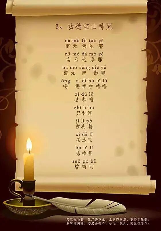 功德宝山神咒是佛教《早晚课诵集》中十小咒之一。《大集经》云:若人诵此咒一遍,如礼《大佛名经》四万五千四百遍,又如转《大藏经》六十万五千四百遍。造罪过十刹土,入阿鼻大地狱,受罪劫尽更生,念此咒一遍,其罪皆得消灭不入地狱。命终决定往生西方世界,得见阿弥陀佛上品上生。读诵此陀罗尼者,能成就八万种吉祥事,能除灭八万种不吉祥事。