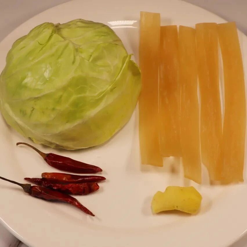 4.干辣椒炒香后下包菜丝,包菜丝大火炒2分钟炒软后下粉条