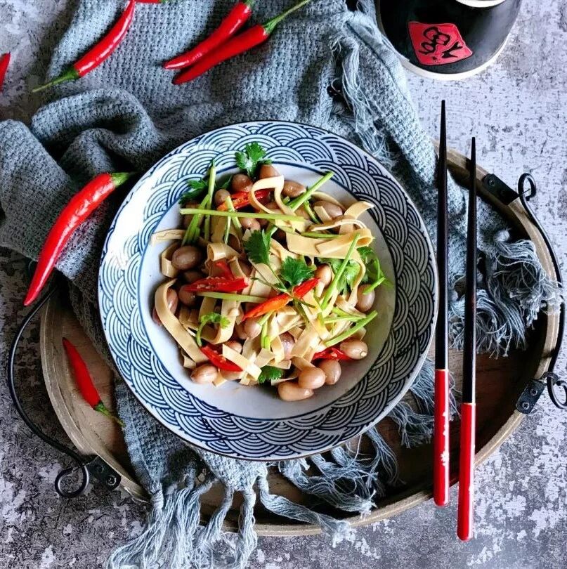 材 料: 花生米500g,素蠔油1大勺,豆腐皮1包,香菜1棵,小米椒3个,香油1勺,八角1个,香叶1片,食用盐、花椒适量 做 法: 1、花生米提前泡好,加入3勺盐,所有的大料开锅煮15分钟 2、豆腐皮切成细条 3、放入锅中焯水备用,不用过凉 4、香菜切段,小米椒切丝 5、把煮好的花生米和豆腐皮都放在一个大碗中 6、加入一勺素蠔油、少许盐、香油、切好的香菜段和小米椒丝,拌均匀即可