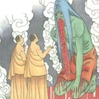 (二)话说有一次阿难陀尊者在结夏安居打坐的时候,看到一个青面獠牙的人逼近他的身边。阿难很惶恐地问:“你到底是什么人?怎么会有这么可怕的面容?”
