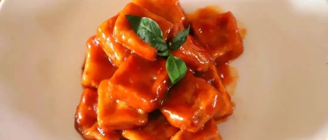 7、把提前炸好的豆腐倒入,浓稠的汁裹匀豆腐即可出锅。