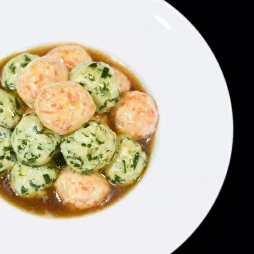 ③ 锅中注水烧开,放入双色豆腐丸慢火汆熟,捞出盛入盘子里。
