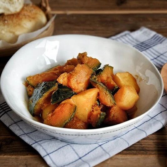 材 料: 南瓜400克,土豆1个,青椒1个,生姜、香菜、植物油、酱油、盐、蔬果调味粉适量 做 法: 1、南瓜、土豆分别去皮,切小块 2、青椒切小片,姜切碎,香菜切段 3、锅中油热后,下入姜爆香,加土豆、南瓜煸炒 4、加酱油、盐调味,煸炒均匀 5、加水没过食材,大火烧开,小火慢炖 6、炖至汤汁见少,加青椒翻炒 7、加蔬果粉调味,装盘撒上香菜