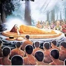 佛告诫大众说:“我虽然在这个世界上,屡次向你们显示我已经进入涅槃,实际上并没有真正进入涅槃,因此你们应当知道,涅槃是常住法,是不变易法。”佛说完这话,就在七宝床上,右胁朝下,头枕北方,脚指南方,面西背东,安然而卧。这时正是中夜时分,万籁寂然,没有声音,如来带着慈祥的微笑在娑罗双树林下舒缓地悠然地进入涅槃之境中。