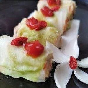 3 | 圆白菜叶开水烫软,切除硬梗,用冷水冲凉,每片包入适量山药泥,卷成筒状,入锅蒸5分钟后取出。 |