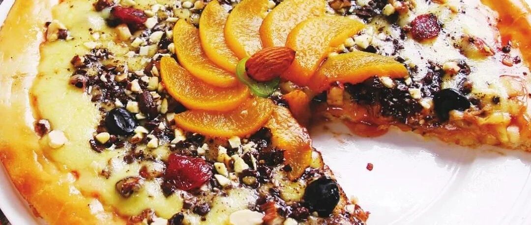这款披萨加了黄桃,也可以根据自己的喜好加些菠萝、杏干、山楂条等酸性的水果,吃起来会更加爽口。