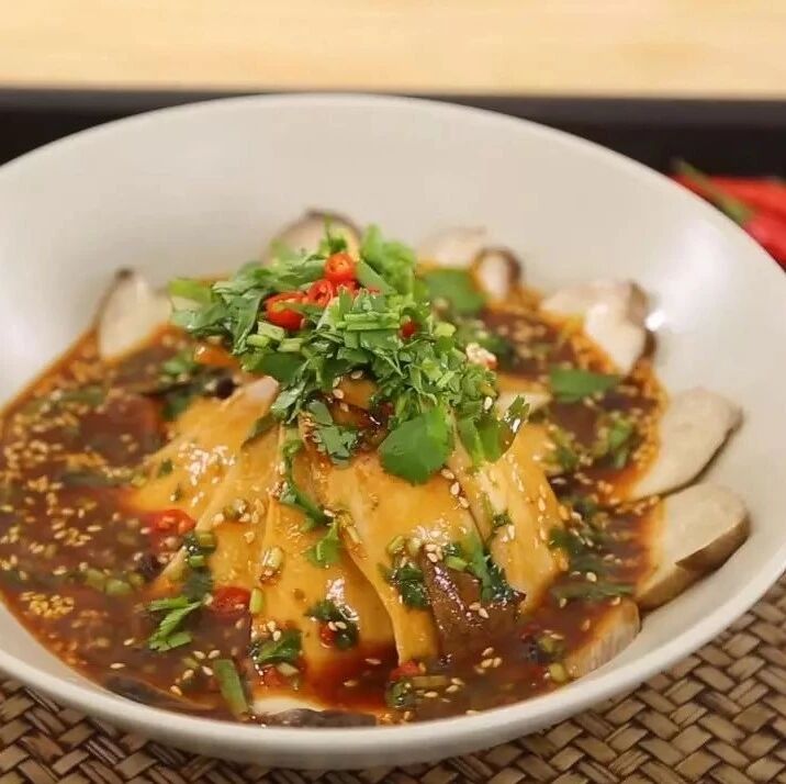 将香菜切,好取一碗加入一半的香菜末,加入辣椒碎、芝麻、胡椒粉、盐、白糖、少许麻油、花椒油、辣椒油、素耗油、陈醋、生抽、花生酱。