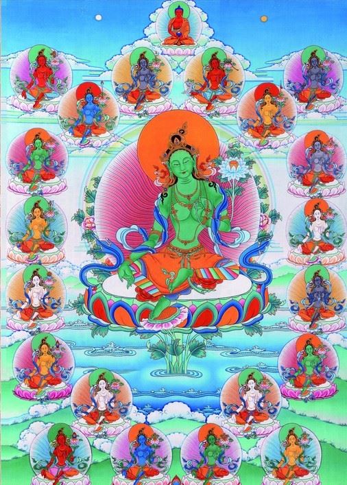 绿救度母,有二十一个化身。是值得修密宗的人敬仰的大菩萨,最容易亲近,也最容易得到相应的,有些人一生专修「绿度母」法,得到很大的智慧,众生只要诚意称念她的名字,持「绿度母」的心咒,修行自能得果。