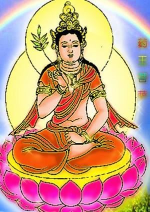 药王菩萨,是阿弥陀佛派来保护念佛者的二十五位菩萨之一。药王,梵文音译为鞞逝舍罗惹,是施与良药、救治众生身心病苦的菩萨。据《观药王药上二菩萨 经》记载,过去无量无边阿僧祇劫有一尊佛,佛号叫琉璃光照如来,佛国名叫悬胜幡。这尊佛涅槃后,在像法时代有一位日藏比丘,聪明多智,为大众广说大乘如来 的无上清净平等大慧。当时在大众中有一位星宿光长者,听说大乘平等大慧之后,心生欢喜,以雪山良药供养日藏比丘和众僧,发愿以此功德回向无上菩提,若有众 生闻己名者,愿其灭除三种病苦。当时长者的弟弟电光明也随兄长拿着各种醍醐良药供养日藏比丘和其他僧众,也同时发大菩提心,祈愿自己可以成佛。那个时候大 众赞叹星宿光长者为药王,赞叹电光明为药上,后来成为药王、药上两位菩萨。同时该经还记载这两位菩萨久修梵行、诸愿已满,药王菩萨于未来世将会成佛,佛号 净眼如来,药上菩萨成佛之后,佛号则叫净藏如来。