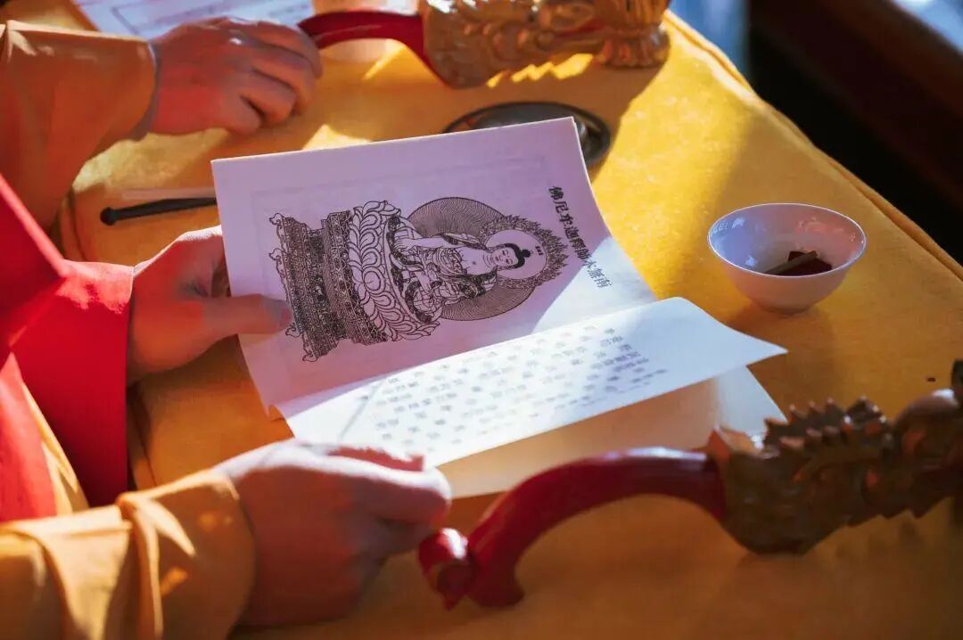 此时,不应将经书敞开或以“人”字型倒放在桌面上,而应该用盖经布把经文盖上,合掌问讯再离开。回来继续读诵佛经时,先问讯,再揭盖经布开始读诵佛经。