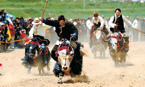 一声枪响,第一小组的6头牦牛势如破竹般冲出起跑线,骑手们口中呼喊,挥动鞭子,呼啸着冲向百米外的终点。比起草原上的骏马,牦牛的速度要慢些,但经过主人们的调教,各个不甘示弱。不过牦牛终归要倔些,这不也不知哪家的牦牛临到终点,却偏偏耍起了牛脾气,让背上的骑手急得火烧屁股,硬是在激烈的赛牛场上演了一出闲庭信步。经过几轮较量,江孜县纳如乡选送的牦牛获得牦牛赛冠军。乡里特地选了10余名美女靓男,吹着喇叭,达玛节跳着藏舞,走在队列前面,为早已用哈达鲜花装扮起来的英雄牦牛开道。