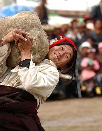抱石头比赛变成扛石头抱石头比赛源于西藏古代,规则很简单,以选手抱着重量不菲的石头行走的距离远近为决胜标准。此次选手们挑战的石头有100多公斤重。为了增加难度,选择的比赛用石头呈椭圆形,石面光滑。这项运动不仅需要有强劲的手抓握能力,还需要双腿、腹部的协同能力,可以使形体健美、肌肉线条分明。好多年了,大家抱的一直是这同一块石头,琼达说。去年一个体育专业的观光客人看了比赛不禁感慨道:面对这样一块没有任何抓手的石头,恐怕专业举重运动员也会望石兴叹。最后一个登场的土登来自藏北草原,他身材魁梧,但参加抱石头比赛已有近10年的历史,不过在江孜达玛节上一显身手还是头一遭。他不慌不忙地走上场时,人们不自禁地喊着他的名字,为他加油。此前的选手多半屈着身子、用大腿托着石头的一部分向前慢慢移动。但见土登把石头一下子抱在胸前,大家还没转过神儿,100多公斤重的石头已经被他扛在了肩头,接着就是一路小跑。跑道旁围观群众们一边惊呼,一边自觉地为他让出一条路来。本来只要踱几步路就会做出裁决的裁判官,这会儿也是拖着手中的皮尺,跟在后面跑。93米!裁判大声喊出土登的成绩。江孜达玛节抱着石头小跑的比赛,历史纪录是34米。土登的新纪录,简直有点离谱。