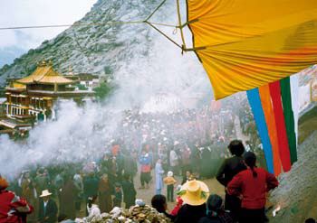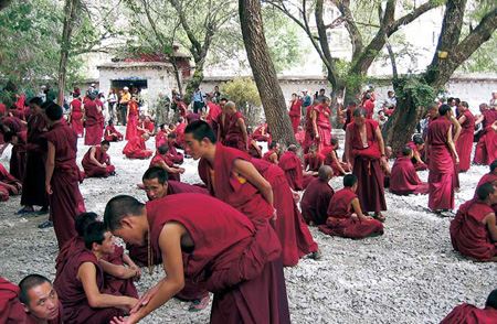 但就年度朝拜人数来说,当属色拉寺。信众前往色拉寺,四大扎仓之一的杰扎仓是必去朝拜之地,因为杰扎仓里面主 供佛为马头明王双尊塑和金刚橛本尊神及其他的法器。马头明王是专门消障除难的本尊神,似乎更接近人们的日常生活需要,所以一年365 天,每天都可以看到朝拜马头明王的信徒们排着长队,逢年过节或是藏历每月的八号、十五号、三十号及星期三,排队朝拜马头明王的人更是络绎不绝。每年雪顿节 期间的展佛活动,色拉寺也是人山人海。但是色拉寺最隆重、最独特、参加人数最多、涉及面积最广的节日还是每年藏历十二月二十七日,这一天信众纷纷来朝拜杰 扎仓主供之一金刚橛本尊神的法器伏藏传承的金刚橛。这就是色拉寺最著名的宗教活动金刚橛朝拜节