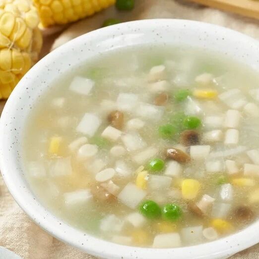 煮过的萝卜丁、青豆、玉米粒,口感脆脆的,而菌菇软嫩香甜,和着汤汁一起下肚,滋味更是妙不可言!
