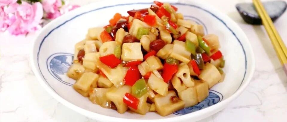 6,下藕丁、青红椒丁,翻炒均匀入味。