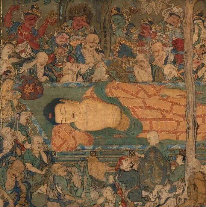 佛陀以吉祥卧的姿势卧在娑罗双树之间床上,很多的弟子围绕在佛陀的四周,大家都是揩鼻抹泪。这时,风息林静,鸟兽没有鸣声,树木之皮流出水滴,百花都萎谢凋零。整个的世间都现出寂寞萧条的现象。