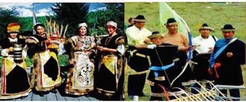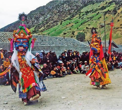 背回新年第一桶水,倒进神佛前的净水碗里,再用它伴糌粑做成供果,兑好青稞酒。在拉萨,初一清早,是到大昭寺朝拜释迦牟尼佛像,在工布,却是带上贡品和青稞酒,来到自家最好的一块庄稼地里,祭祀丰收女神,他们在地里竖起一根长长的木杆,木杆上挂经幡,下挂一把麦草,麦草象征丰收女神的宝座。用石头在木杆前搭个祭台,在台上摆好各种供品,煨烧青草香树,通知田地的保护神,来接受供奉和膜拜。人们用特殊的调子高喊三声:洛雅阿妈,洛雅阿妈(意为丰收女神),请用餐吧!然后,他们围着祭台唱歌,跳舞,娱乐丰收女神,请求保佑庄稼丰收。