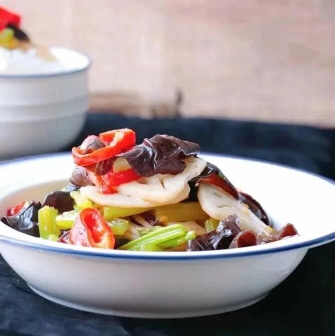 莲藕1块、山芹1棵、彩椒1个、生姜适量、木耳少许、醋少许、食用油少许