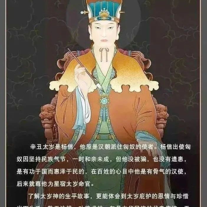 值年太岁就是道教的岁神,民间称六十甲子。古代术数家以木星运行十二年为一周天,将黄道分为十二等份,以岁星所在的部分为岁名,称岁阴,又配以十岁阳,由甲子、乙丑按天干地支排下去,一直排到壬戌、癸亥共六十位太岁神。他们按岁轮值,一岁一个主宰,被称为值年太岁,执掌人间祸福,俗称岁君。岁君所在的方位以及与之相反的方位都属于凶方,所忌甚,众煞之主。《黄帝经》说:"太岁所在之辰,必不可犯"。汉朝王充《论衡・难岁》:"方今行道路者,暴死仆死,何以知非触遇太岁之出也?""且太岁,天别神也,与青龙无异。"因此人们想方设法避开不祥,或烧香祈求太岁神开恩保佑。 阴阳术数家把六十甲子分为属金、木、水、火、土五行,再按阴阳、盛衰、轻重,以人形之,以物象之,贵贱得失、荣枯贤愚无不与之相关,使六十甲子在民间的影响越来越大。辛丑太岁是杨信,他原是汉朝派往匈奴的使者。当时汉朝自认为十分强大。它占领东面的秽貉,以朝鲜为郡,西面以酒泉为郡,隔绝了匈奴和羌的通道,又和西方的月氏、大夏建立了和亲关系,又将公主嫁给乌孙王,客观上切断了匈奴和他们的联系,往北又扩充广田直至乌孙北面,匈奴终不敢出声。汉根本不把匈奴放在眼里。认为匈奴比自己要弱得多,可以使它臣服。先前汉朝派使者王乌出使匈奴,按照匈奴的规矩,汉使者想进入穹庐见单于,必须放弃汉的礼节并且将面部涂黑。王乌是北方人,懂得胡人的习俗,所以既去汉节又黥面,得到单于的喜欢而进入穹庐。杨信不是汉朝的重臣,出使匈奴并不引起单于的重视。他为人刚直倔强,不肯去节也不黥面,单于不愿接近他,只是在穹庐外会见杨信。会谈时,杨信也十分明确地说,想要与汉和亲就把太子作为人质。单于说,以前订约都是汉派公主带了许多贵重的东西前来和亲,现在要人质,这办不到。后来汉再派王乌出使,单于美言哄骗,以至汉在长安为单于专修官邸,但狡诈的单于不至。匈奴使者病于汉,虽给医给药仍不幸而死,单于认为这是被汉陷害而死。结果是汉使路充国被扣不归,还损失了大量的作为丧礼的财物。杨信出使匈奴因坚持民族气节,一时和亲未成,但他没被骗,也没有遗患,应是有功于国而惠泽于民的,在百姓的心目中他是有骨气的汉使,后来就尊他为星宿太岁命官。无独有偶,宋史列传第十九也记有一个杨信,说杨信是"瀛州人,初名义。显德中隶太祖麾下为裨校。宋初权内外马步军副都军头。建隆二年,领贺州刺史。改铁骑、控鹤都指挥使,迁殿前都虞侯,领汉州防御使。干德初亲郊,为仪仗都部署。"后来他嗓子失音,皇上亲自到他的家里慰问,给了他二百万钱。干德五年改为静江军节度使。曾受诏逮捕杜廷进等十九人。干德六年迁殿前都指挥使,改领建武军节度。后患病,皇上到其宅第看视。杨信说,自己遭遇两朝,恩宠隆厚。叙谢感慨,涕泗横流。第二天杨信病卒,赠侍中。因杨信是一个忠臣,所以一直得到升迁。他的两个弟弟杨嗣和杨赞也得到皇上重用。六十甲子作为历算,在中国古已有之。但六十甲子作为太岁命官,约摸始于宋代,但将同时代人作为神灵崇拜实属罕见。汉代杨信民族气节高于一切,宋代杨信只是忠臣,他只报君王不思民。据此,汉代的杨信当为太岁。文章转载网络、版权归原作者所有,侵权告知删!