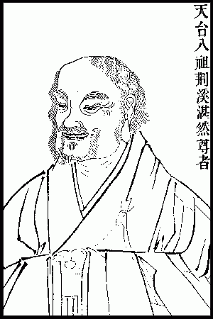湛然(711~782),唐代高僧,天台宗第九祖。俗姓戚,常州荆溪(今江苏宜兴)人。家世业儒,独好佛法,十七岁时从金华方岩大师受《天台止观》;二十岁入左溪玄朗大师之门,研习台宗教义,尽得其妙旨。三十八岁出家于宜兴净乐寺,又至越州从昙一律师学律,后于吴郡开元寺讲《摩诃止观》。玄朗大师示寂,师继其席,以中兴天台为己任。师提倡无情有性说,主张木石等无情物亦有佛性,发展台宗教义。先后住持兰陵、清凉诸刹,所至之处,四众景从,德誉广被。天宝、大历年间,玄宗、肃宗、代宗优诏连征,师皆称疾不就。晚年居天台国清寺。