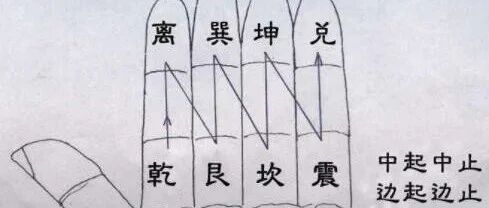 这里不难看出八卦在手指上排列的具体位置,从四个手指根部向右看,乾、艮、坎、震四阳卦,都按顺序从四指根部横着向右排。订阅号易经天下。再从四个手指尖来看,离、巽、坤、兑四阴卦顺着向右横排。再从食指尖节离卦开始向右顺念,即离、巽、坤、兑,从食指根部乾卦向右横念,即乾、艮、坎、震,翻卦掌就是这样排出来的。