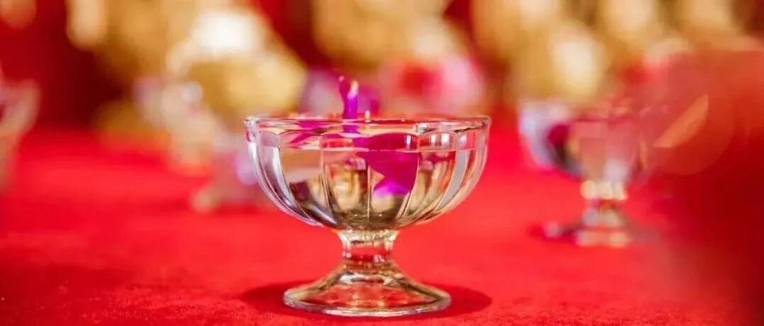 我们常说:“茶七酒八”。同样,我们在倒供水时也不要倒得太满了,水应距杯子上缘约一粒米,也就是八分满左右,并且供台上也不要有溢出的水。