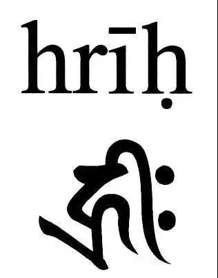 观想眼前虚空中出现莲花台,台上有一个种子字hrih如下,放出大光明,遍照无量无边的世界,一切有情众生遇到此光皆获得解脱,光明回收于种子字,变成马头明王。
