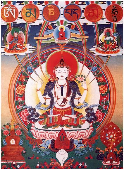 四臂观音是佛菩萨之菩提心所化现,在很久以前已成正等正觉之古佛,称为“正法明如来”,为救度不同众生而示现不同的相。世人称为大慈大悲的观世音菩萨,与娑婆世界之众生特别有缘,因为他经常示现救度众生,故此最为受人供奉。在金刚乘中,最为人喜爱修的法门是“四臂观音”和“千手千眼观音”。四臂观音的报身相中:白色的身代表清净无暇,四臂代表四种佛行,即“息”、“增”、“怀”、“诛”。“息”是平息所有的痛苦、障碍及困难,“增”增加福报、智慧、长寿、财富等,“怀”是救度众生、领导他们修行,“诛”是诛灭他们种种恶念、克服外界魔障等。四臂的手,前两只合十胸前,抱着一颗如意宝珠,代表能满足所有众生的要求;另外的两手是:右手持一串水晶念珠,代表不停地救度众生。左手持一朵莲花,代表清净的心,没有瑕疵。观世音的左边肩膀披上一块鹿皮,是代表慈悲及纯正的心,而头顶上戴着的五佛冠代表五方的智慧,其它所穿着的绸缎及璎珞都是代表庄严的报身相,而双腿作双盘的金刚坐姿是代表稳固禅定的境界。总括以上六种装饰代表“布施、持戒、忍辱、精进、禅定及智慧”的六波罗密多,是表示“六度万行”的成就。坐在月盘上代表慈悲方便的法,月盘下是莲花,代表清净的境界。四臂观音的心咒是六字大明咒,即嗡、吗、呢、呗、嚜、吽,用以加持六道众生(天、人、阿修罗、畜生、饿鬼、地狱),净化恶业、恶心及障碍而脱离轮回之苦,走向六成就悉地。此完美之咒语极为宝贵。只要有一次以清净、恭敬的心听到此咒,即可令修行人不会退心。如服少金刚,决定不消,终必成就无上菩提。如果任何动物或昆虫在死前听到此咒,则死后即可脱离三恶道并修持佛法。只要想着六字大明咒,即能将无始以来所积聚的一切罪恶、业障消除,可往生极乐世界。只要接触此咒的字,即是接受无量佛菩萨的灌顶。