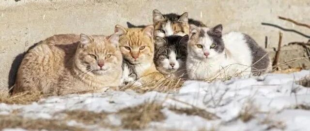 能找到热源取暖的流浪猫很少,大部分流浪猫是找不到热源的,但为了活下去,一向独行的流浪猫们会抱团取暖。它们3-5个围成一团,找一个无人的墙角,瑟瑟发抖的紧紧抱着彼此,用自身的温度相互取暖,这也正是为什么流浪猫进入冬季前,需要发出浓密毛发的原因。