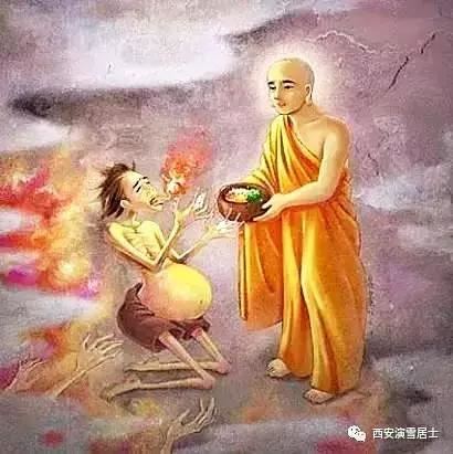 ‘ 诵神咒七遍,泻着树下,观想此食充塞虚空,周遍法界,是时十方一切饿鬼,以陀罗尼威得力故,皆得食吃,亦不变化作脓血,亦无遮禁,自恣啖食,充足饱满,灭饥汤火,无诸痛恼。’
