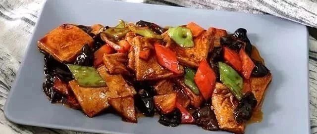 6.然后把煎好的千叶豆腐倒入锅内,翻炒均匀。